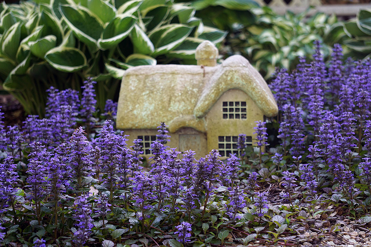 A rustic fairy house peeks out from purple sage flowers in mid May. Green and white variated hostas can be seen in the background. The purple flower could be bugleweed and not sage, which has pretty purple flowers and grows from ground-hugging ground cover.
