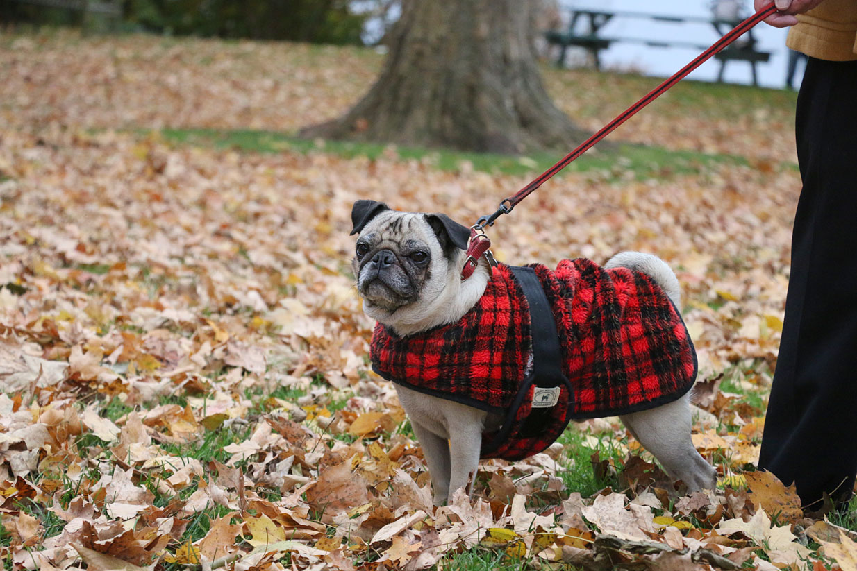 This cute Pug Dog wearing a red plaid and black Sweater is surrounded by with Fall Leaves. A leash can be seen in the photo. Download This Image Wild Turkey in the FallCat Looking up with Box in BackgroundDanish on a Plate at BrunchBelgium Waffles and FruitFairy Garden House in Summer with Sage (Bugleweed)Orange Cocktail on a Table